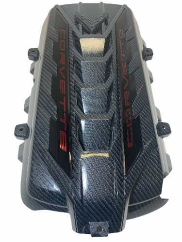 Custom Hydro Dipped 2020+ Corvette Engine Cover Sport Carbon Fiber With Corvette Red Letters