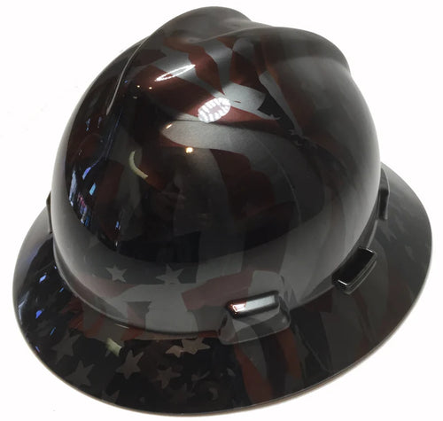 Custom Hard Hat Hydro Dipped Metallic Graphite American Flags MSA V-Gard Full Brim