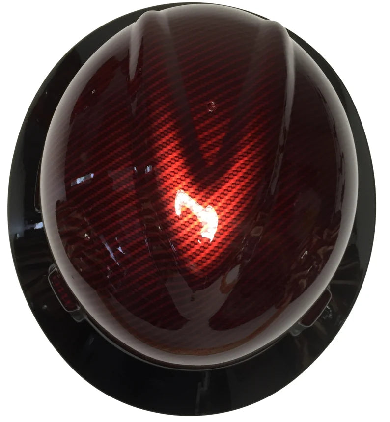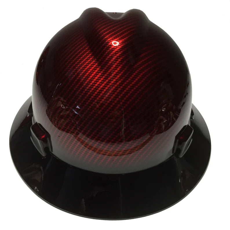 Custom Hard Hat MSA V-Gard Full Brim Kandy Red Carbon Fiber Hydro Dipped with Black Brim