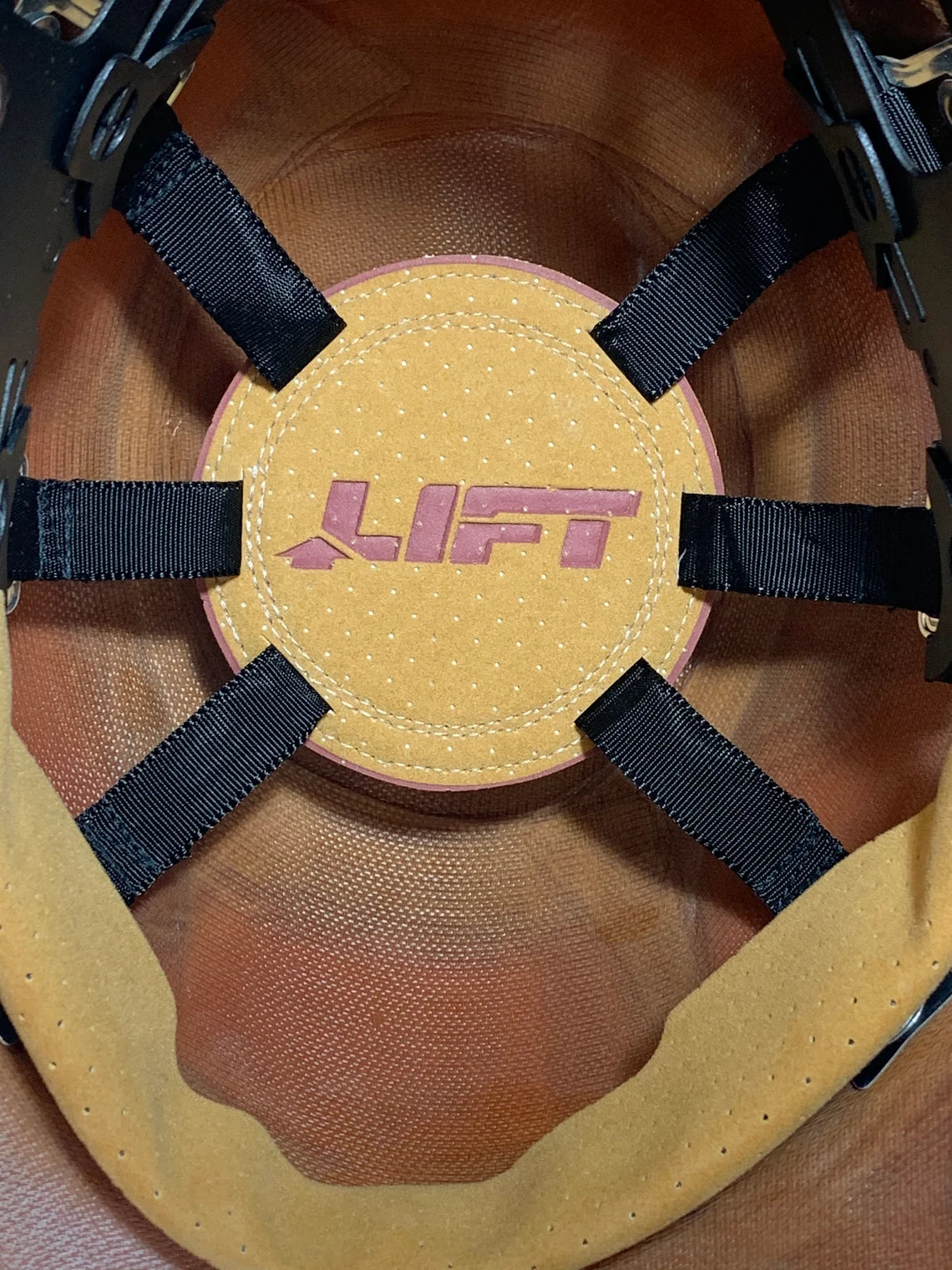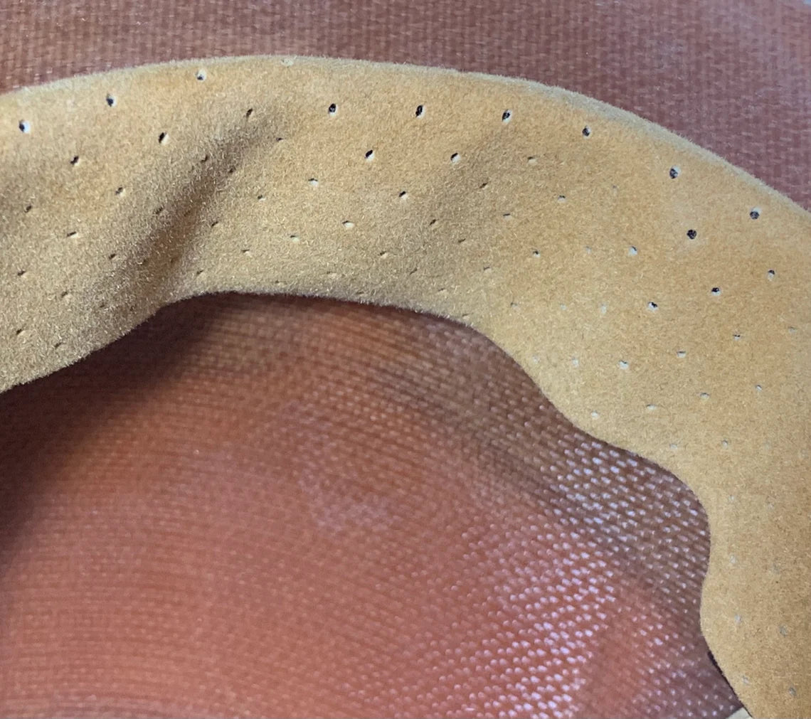 Perforated synthetic leather comfort dome with molded EVA foam insert for additional shock absorbing protection to the top of head