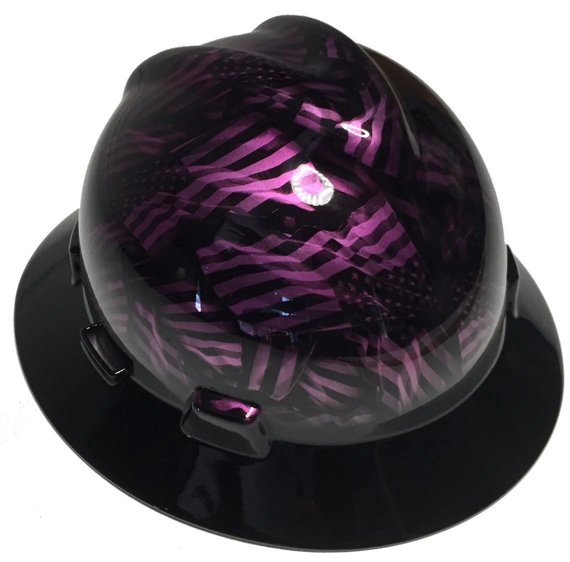 Custom Hydro Dipped Hard Hat MSA V-Gard Full Brim Kandy Purple Negative American Flags with Black Brim