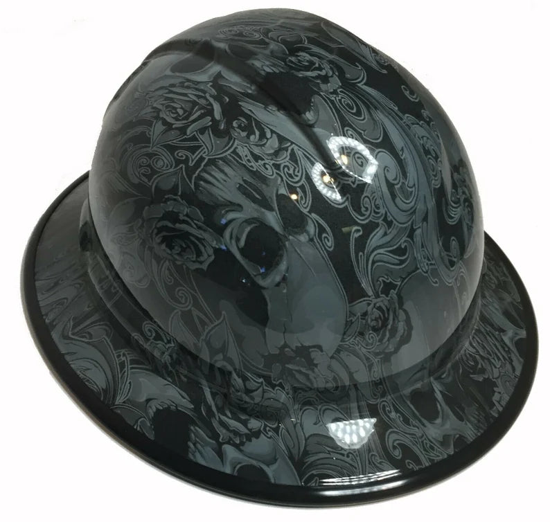 Custom Hydro Dipped Hard Hat Slate Gray Filigree Skulls Full Brim Ridgeline With Black EdgeGard
