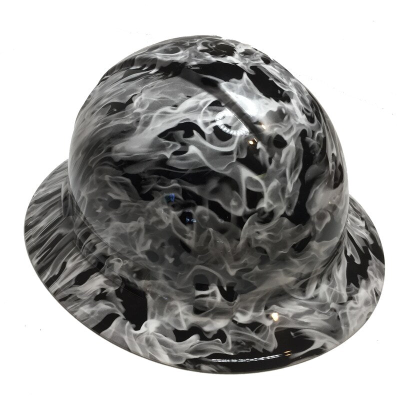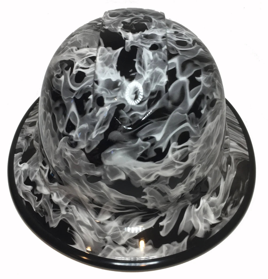 Custom Hydro Dipped Hard Hat White Flames Full Brim Ridgeline With Black EdgeGard
