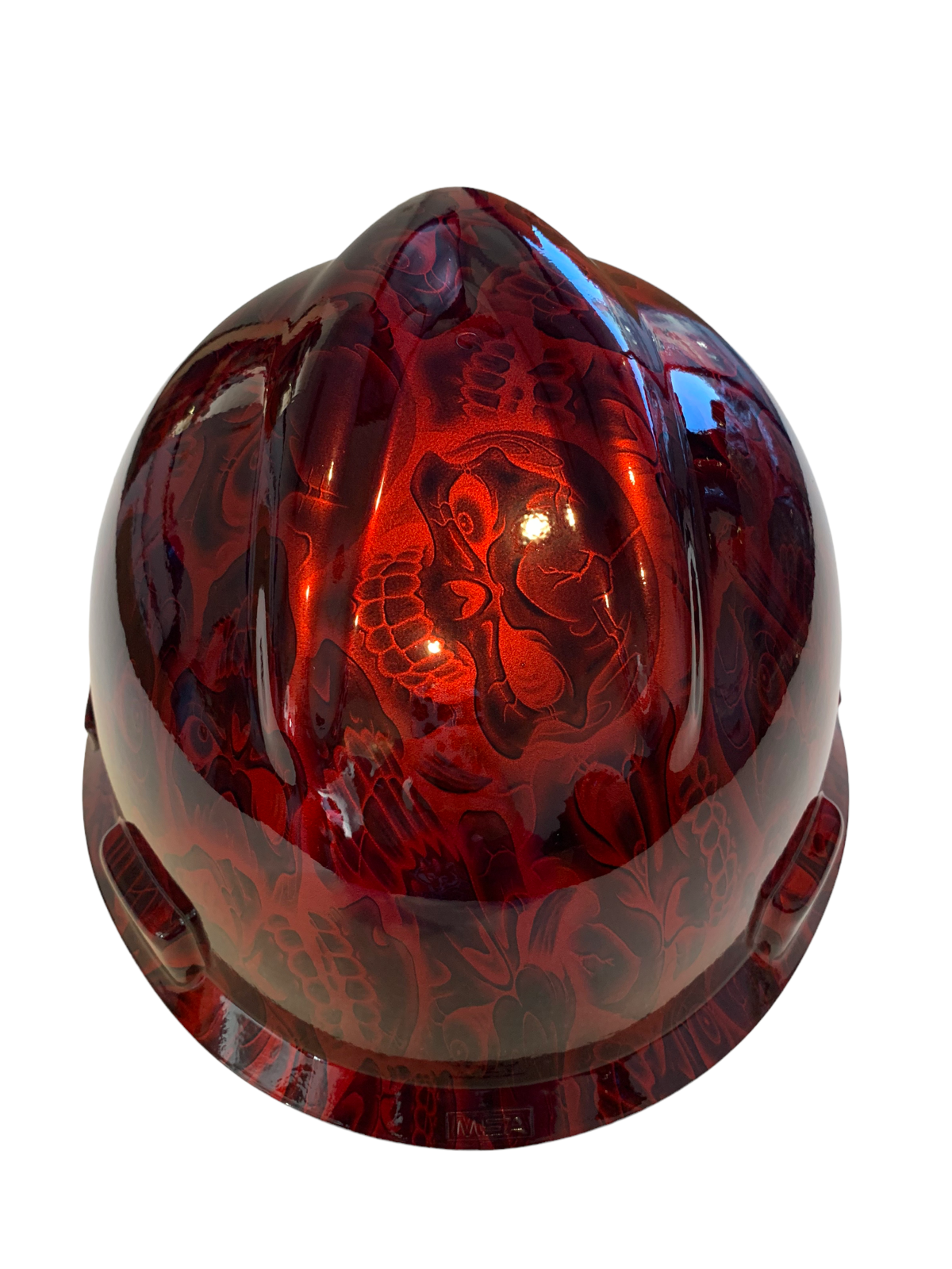 Hard Hat MSA Cap Style Custom Hydro Dipped Kandy Red Negative Insanity Skulls