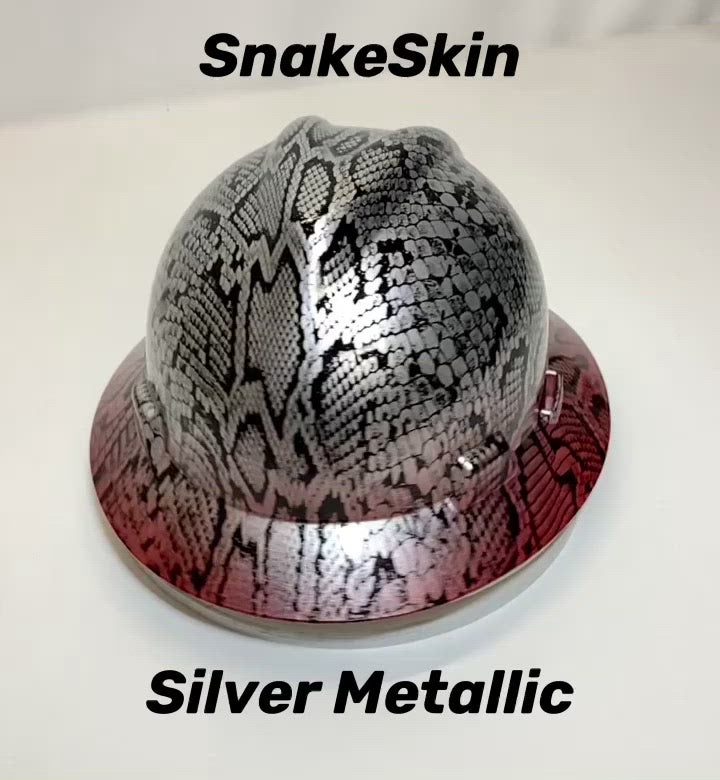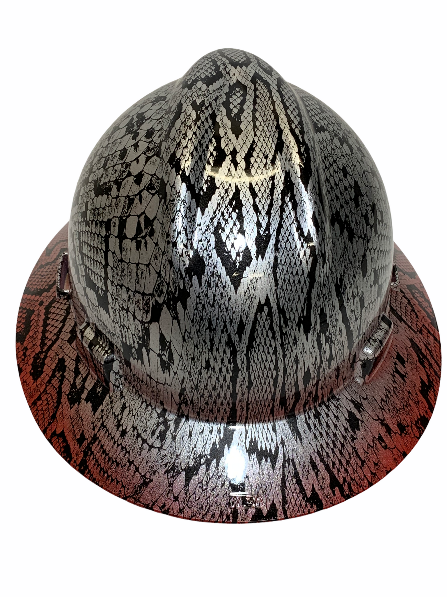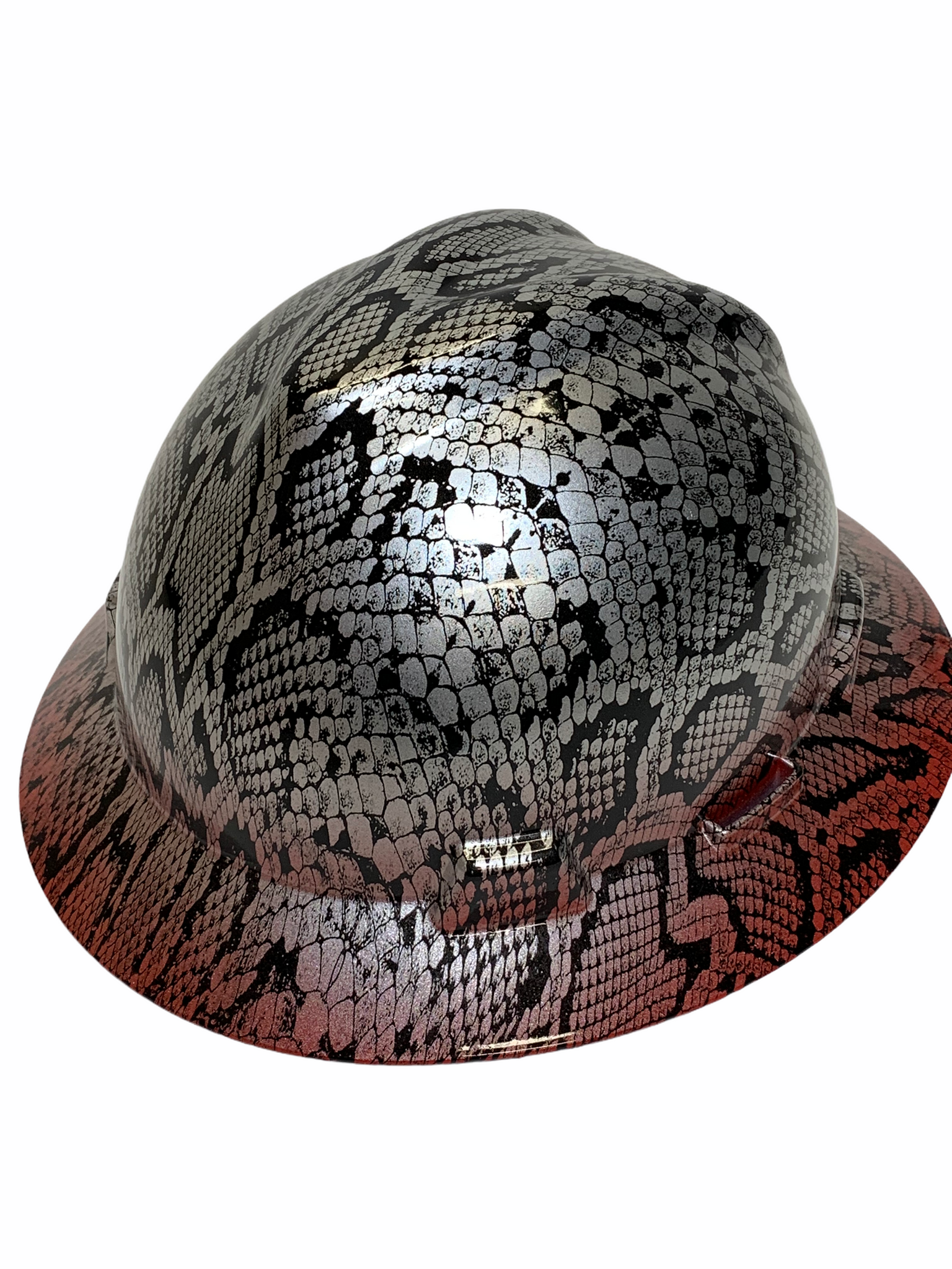 Custom Hydro Dipped Silver Metallic Snakeskin Over Red Brim Hard Hat MSA V-Gard Full Brim