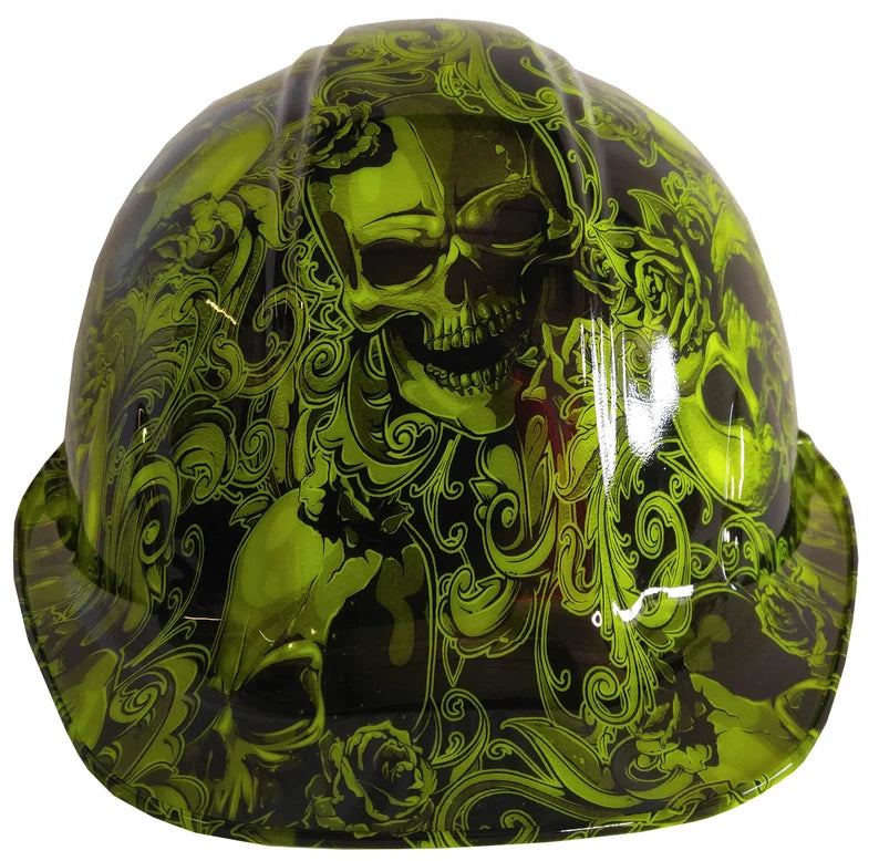 Hydro Dipped Hard Hat SL Series Cap Style Custom Hi Vis Green Filigree Skulls